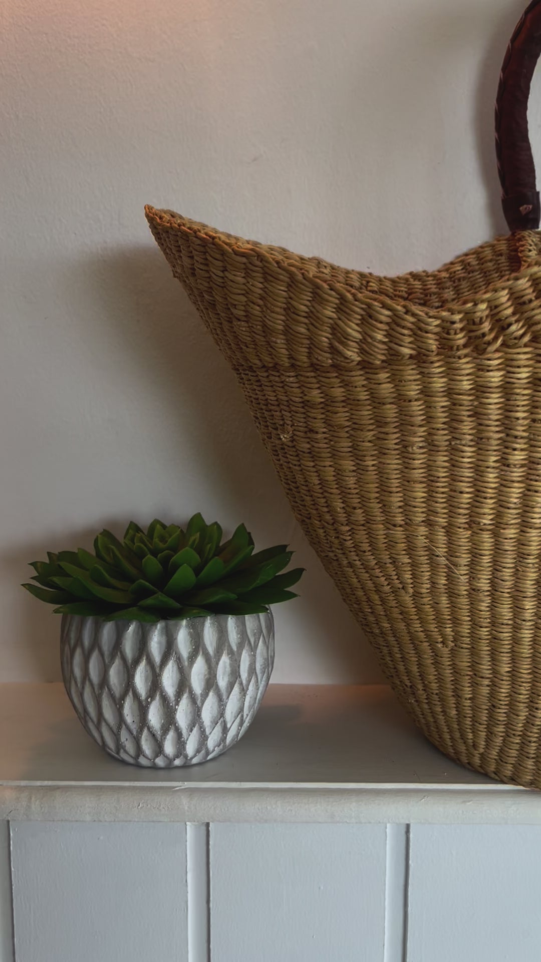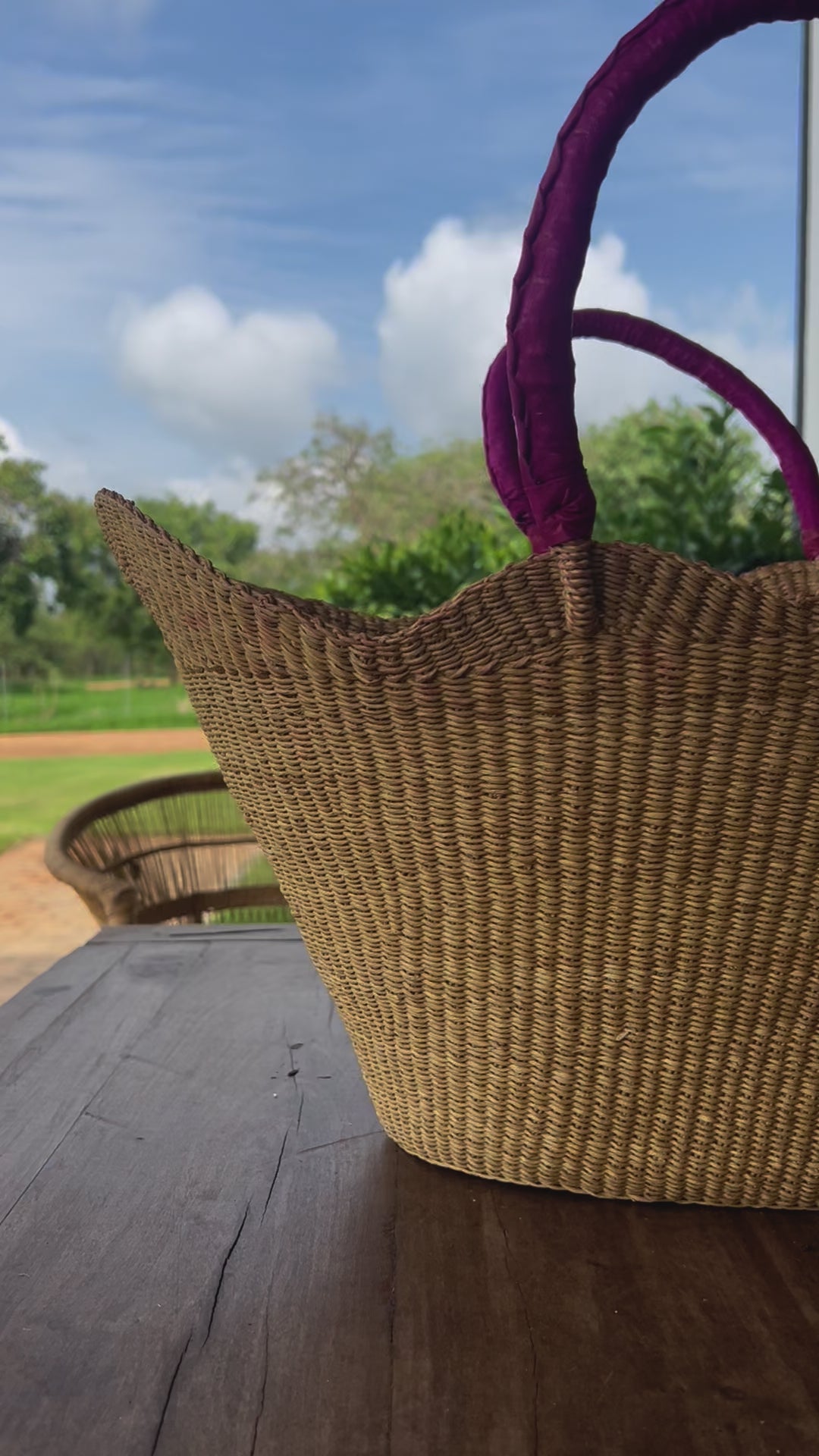This gorgeous and exclusive design fresh out of Ghana cannot be found elsewhere! A beautiful handwoven basket featuring organic curves and handstitched leather handles. Originating from the home of Africa's most beautiful shopping and beach baskets, this Bolga basket is a completely new design.